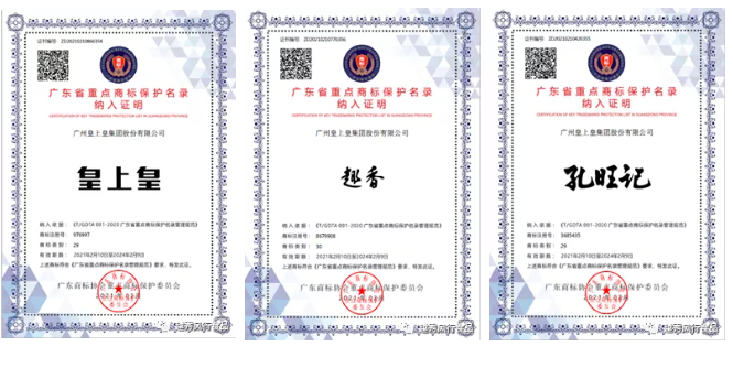 “皇上皇”“趣香”“孔旺记”商标被纳入广东省重点商标保护名录,将为皇上皇股份在知识产权申报、维护、应用以及保护等方面提供有力保障,助力老字号品牌做大做优做强。